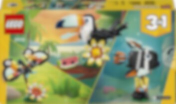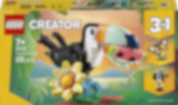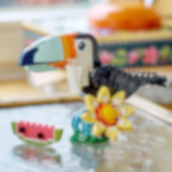 Bouw een kleurrijke tropische toekan en bouw hem daarna om tot een gekko of een tropische vis met dezelfde stenen! Wilde dieren: Tropische toekan (31173) is een prachtige Creator 3-in-1-set met 225 stenen. De toekanfiguur zit op een tak met een grote bloem en een plak watermeloen. Drie tropische dierbouwprojecten voor natuurliefhebbers vanaf 7 jaar.