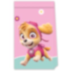 4 uitdeelzakjes van papier met een vrolijke afbeelding van Skye op een roze achtergrond met kleine bloemetjes. Perfect om te vullen met snoep, kleine speeltjes of verrassingen die kinderen mee naar huis kunnen nemen na het kinderfeestje.