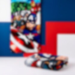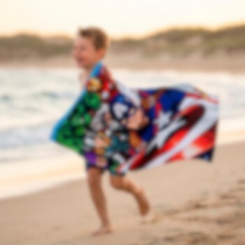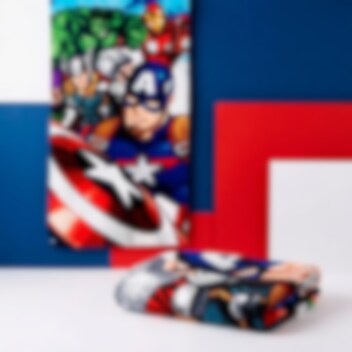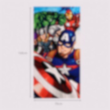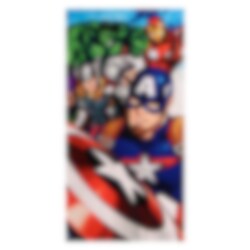 Neem je Avengers-helden mee naar het strand of het zwembad met deze kleurrijke badhanddoek. De afbeelding toont Captain America, Hulk, Iron Man en Thor in een krachtige pose.