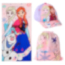 Een kleurrijk en praktisch set in Disney Frozen-thema die een handdoek, pet en gymtas bevat - perfect voor het strand, het zwembad en alle avonturen van de zomer. De mooie afbeeldingen met Elsa, Anna en Olaf geven een speels en sprookjesachtig gevoel.