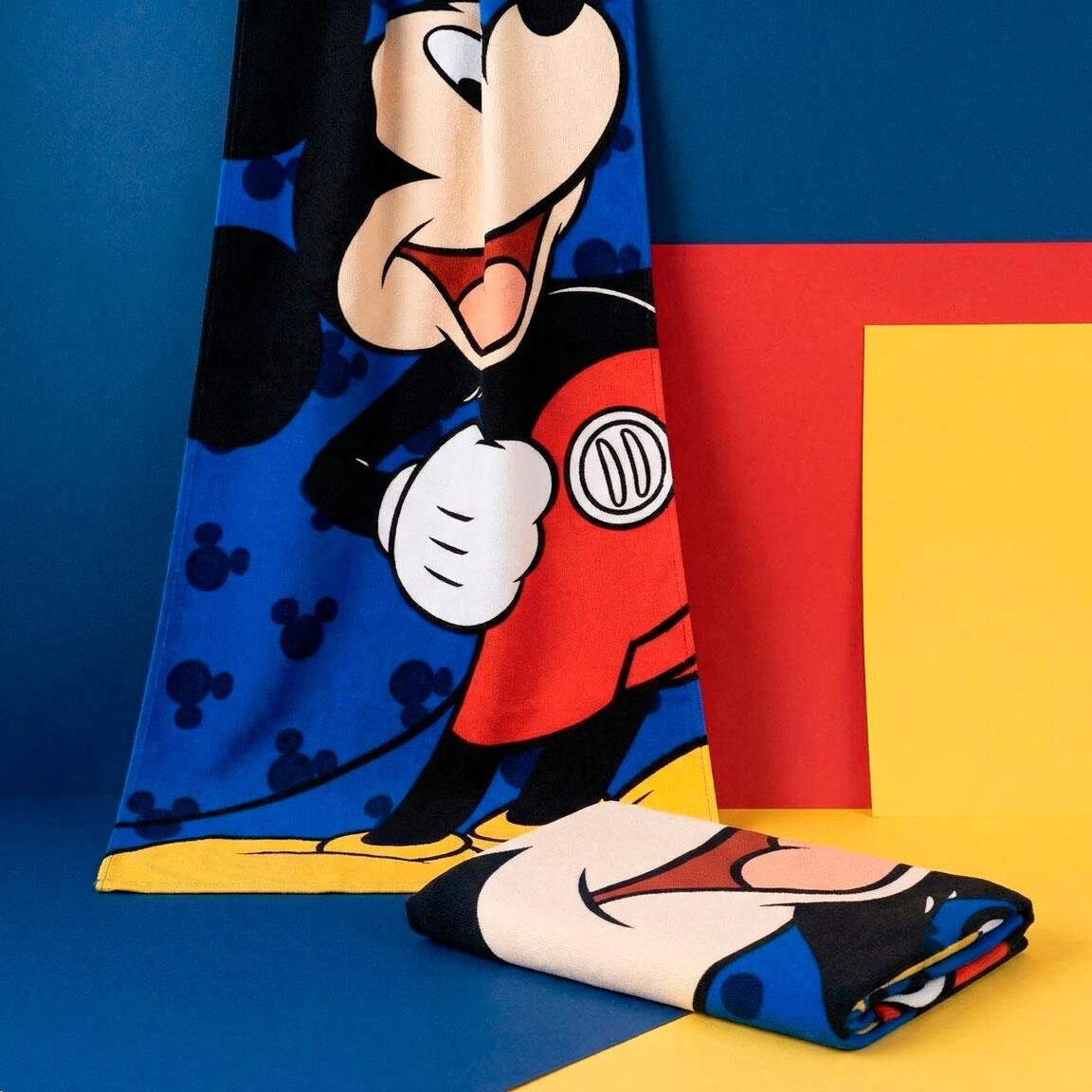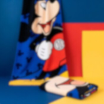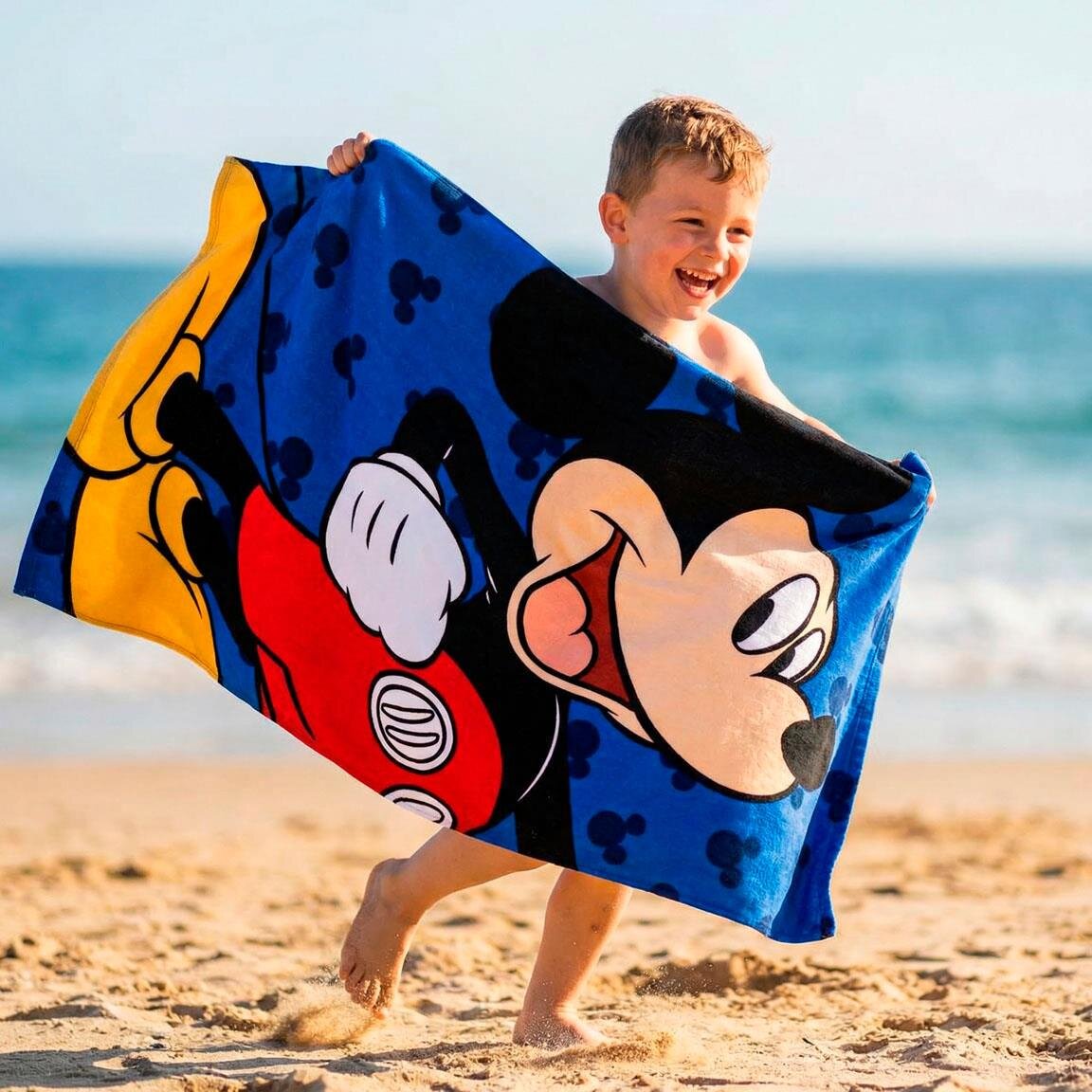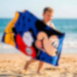 Maak het badmoment nog leuker met een badhanddoek versierd met iedereens favoriet, Mickey Mouse. Met zijn brede glimlach en de klassieke rode broek verspreidt hij direct vrolijkheid op het strand of bij het zwembad. De blauwe achtergrond met kleine silhouetten geeft de handdoek een extra speels gevoel waar de kinderen dol op zullen zijn.