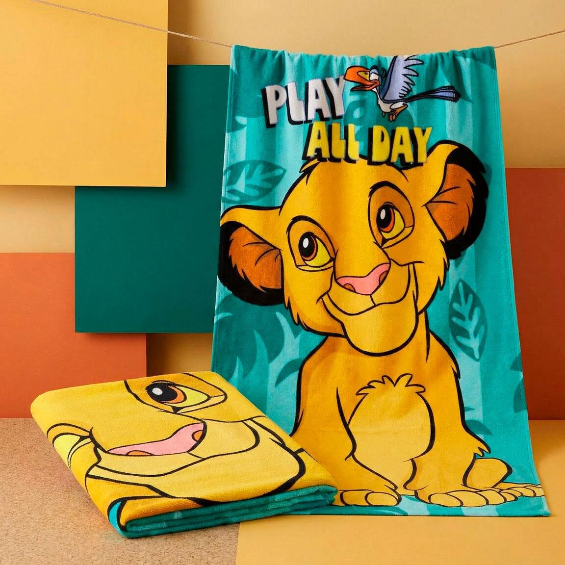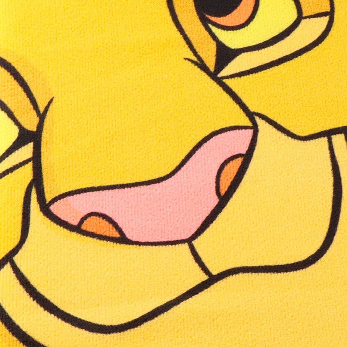 Laat de avonturen van The Lion King meegaan naar het strand met deze kleurrijke badhanddoek. De afbeelding toont een vrolijke Simba klaar voor kattenkwaad, terwijl zijn vriend Zazu erboven vliegt tegen een turquoise achtergrond met junglebladeren.