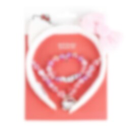 Voeg een schattige touch toe met deze charmante sieradenset van Hello Kitty. De set bevat een wit diadeem met kattenoortjes en een roze strik, een glinsterend kralenarmbandje met de letters “LOVE” en een bijpassende ketting met een mooie Hello Kitty-bedel. Het perfecte accessoire voor kinderen die dol zijn op alles wat schattig en glinsterend is.