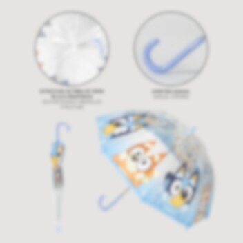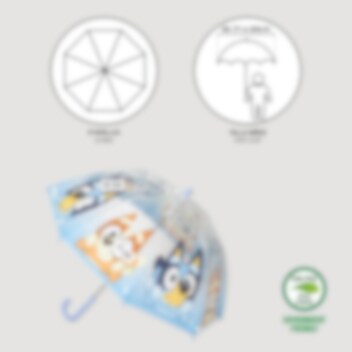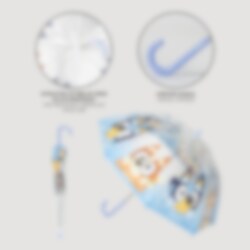 Maak regenachtige dagen vrolijker met deze kleurrijke kinderparaplu met Bluey en Bingo! De paraplu heeft een diameter van ca. 71 cm en is gemaakt van stevig PoE en glasvezel. Hij heeft 8 baleinen en wordt handmatig geopend. Het speelse design met Bluey en Bingo maakt deze paraplu tot een favoriet bij alle jonge fans van de populaire tv-serie.
