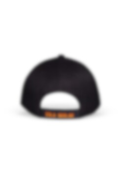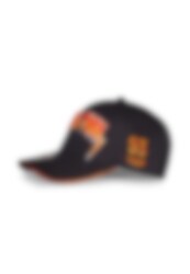 Coole baseball pet in zwarte kleur met oranje tinten en met het iconische Jurassic Park-logo op de voorkant van de pet en een dinosauruslogo-afbeelding aan één kant.