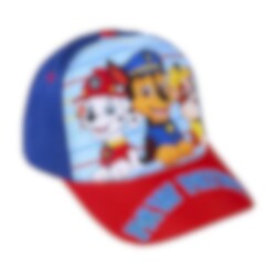 Mooie kinderpet in rood- en blauwtinten met motieven van de populaire reddingshonden Marshall, Chase en Rubble van Paw Patrol. De pet is gemaakt van 65% katoen en 35% polyester.