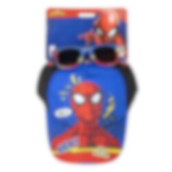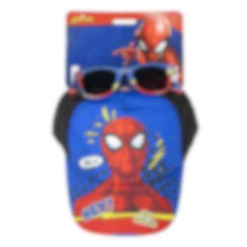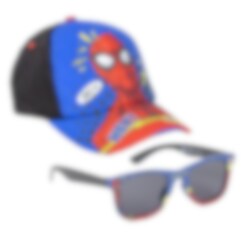 Een complete set met zowel een mooie blauwgekleurde pet als een paar premium zonnebrillen, beide in kindermaat. Op de bril staan motieven uit de Spiderman-serie.