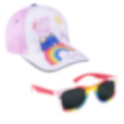 Op de kleurrijke zonnebril staan motieven van Peppa Pig en een regenboog.