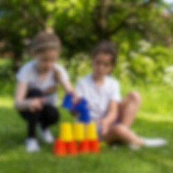 Een buitenspel waar je met je vrienden kan concurreren. Het spel bevat inhoud voor drie verschillende wedstrijden. Gooi erwtenzakjes op bekers, doe zaklopen en balanceer een ei op een lepel.