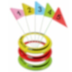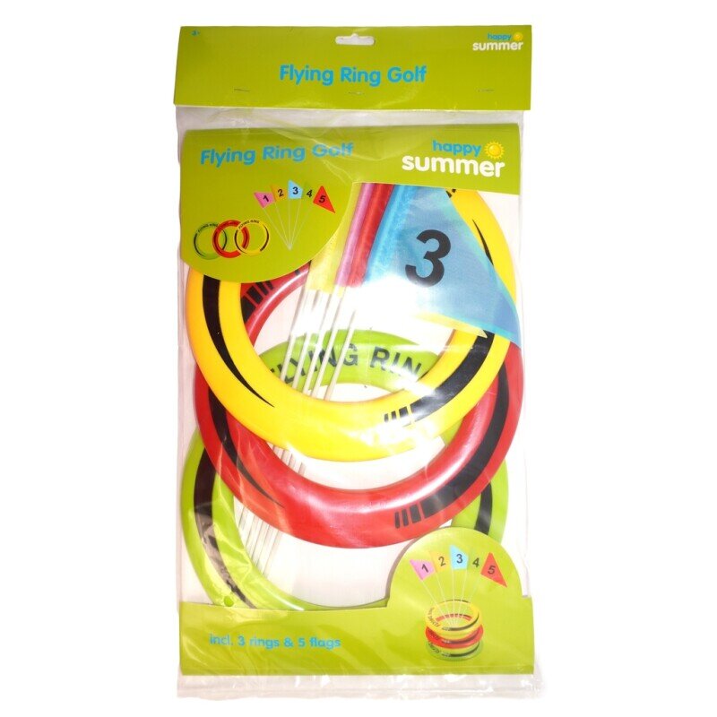 Creëer een leuke activiteitenbaan in de tuin, op het strand of in het park met deze vliegende ring golfset. De set bevat drie kleurrijke ringen en vijf doelvlaggen met verschillende punten, waardoor het gemakkelijk is om het spel te variëren en eigen spelregels te bedenken.