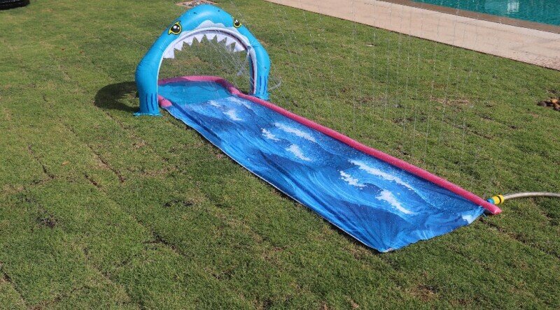 Leuke waterglijbaan in haaienthema die perfect zal zijn tijdens de heetste zomerdagen. De glijbaan is 3 meter lang en heeft een ingebouwde watersproeier in de boog. Vanaf 3 jaar onder toezicht van een volwassene.