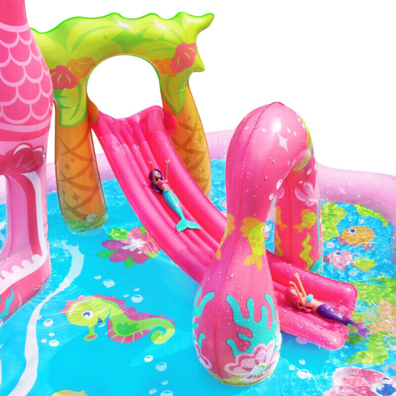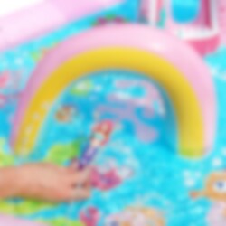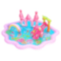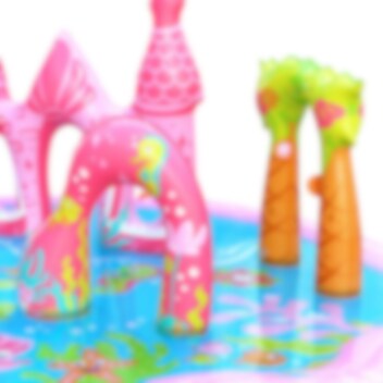 Verander de tuin in een magische waterwereld met deze kleurrijke waterspeeltuin met zeemeerminthema. Hier vind je veel leuke details die uitnodigen tot spelen, spetteren en zomeravonturen, met een glijbaan, een regenboog, een zeemeerminkasteel en kleine figuren die het spel extra fantasierijk maken.
