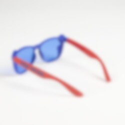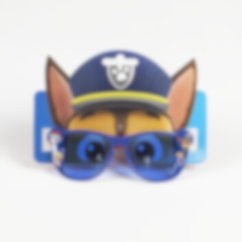 Premium zonnebril voor kinderen in rood en blauw met coole motieven en tekst van Paw Patrol. Op de monturen rond de blauw getinte glazen staan aan de ene kant Marshall en Rubble en aan de andere kant Chase.