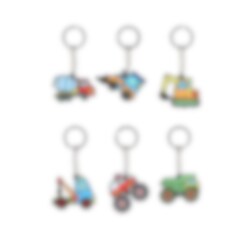 Een kleurrijke sleutelhanger met motieven van verschillende voertuigen zoals een graafmachine, vrachtwagen en tractor. Gemaakt van zacht rubber met een zwarte achterkant en metalen ring, zodat hij eenvoudig te bevestigen is aan sleutels, rugzakken of tassen. Perfect als feestverrassing of cadeau voor kinderen die van voertuigen houden.
