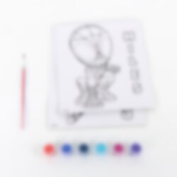 Het set bevat zes kleuren, meerdere afbeeldingen op kaarten en één penseel, en kan meteen gebruikt worden.