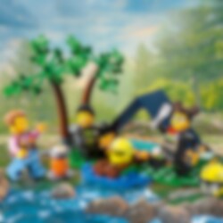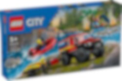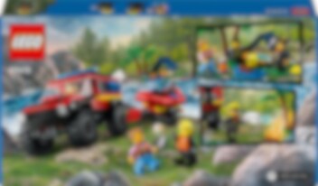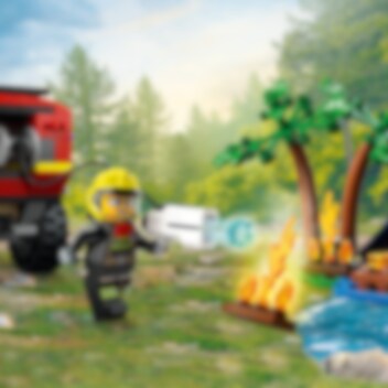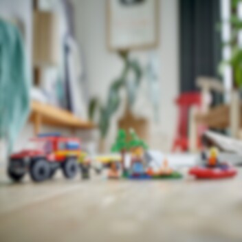 Een kampeerder is gestrand door een bosbrand en een rivier waarvan het water snel stijgt. Tijd om de 4x4 brandweerauto en reddingsboot in te zetten! De enorme banden en stevige ophanging van deze terreinwagen maken hem ideaal voor ruw terrein. Laad de reddingsboot in, koppel de aanhanger vast en rijd naar het rampgebied. Gebruik de krachtige brandblusser van de truck om de vlammen te doven, stap in het bootje en steek de rivier over om de vakantieganger te redden!