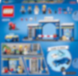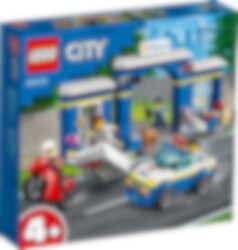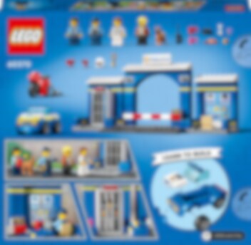 Het is een rustige dag op het LEGO® City politiebureau, wanneer plotseling de politiehond alarm slaat. Woef woef! De gevangenisdeur gaat met een klap open en de boef rent weg! Hij is achterop een motor gesprongen die zojuist de celdeur uit zijn scharnieren heeft getrokken. Schakel snel het onderscheppingsvoertuig in en achtervolg de boeven! Er wachten je avonturen boordevol actie in LEGO City.