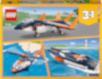 Beleef geweldige avonturen, hoog in de lucht en op het water! Neem plaats achter de stuurknuppel van het ongelooflijke Supersonisch straalvliegtuig en haal halsbrekende stunts uit in de lucht. Bouw het straalvliegtuig na de landing om in een helikopter met draaiende rotorbladen en stijg weer op of kies voor supersnel plezier op het water en bouw het vliegtuig om in een speedboot. De mogelijkheden zijn eindeloos met deze 3in1 set.