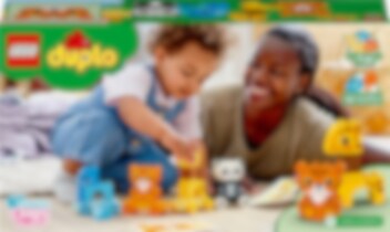 Wie houdt er nou niet van dieren? Laat peuters kennismaken met het dierenrijk met LEGO® DUPLO® Mijn eerste dierentrein (10955).Dierenoptocht die ze kunnen meetrekkenEr valt veel te beleven voor echte dierenvrienden met de olifant, tijger, giraf en panda. Peuters ontwikkelen hun fijne motoriek en ontdekken een magische wereld vol fantasierijke rollenspellen terwijl ze bouwen en herbouwen, de wagons achter elkaar zetten, de dieren op de trein plaatsen, ervan afhalen en op elkaar stapelen. Innovatieve functies, zoals de schommelende nek van de giraf, maken dit leerzame speelgoed nog leuker. Kinderen kunnen de stenen op de bouwkaarten met afbeeldingen leggen tijdens het bouwen. Koppel de trein aan ander DUPLO speelgoed met wielen voor nog meer plezier.Praktisch en slimLEGO DUPLO speelgoed brengt onbegrensd speelplezier, zelfexpressie en spelenderwijs leren binnen handbereik van jonge kinderen. Ouders en kinderen delen waardevolle ontwikkelingsmijlpalen terwijl ze samen spelen.