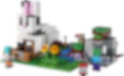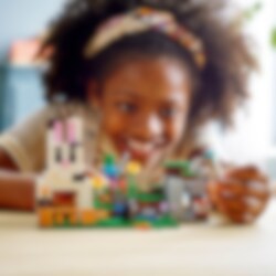 Minecraft® spelers en konijnenliefhebbers vanaf 8 jaar zullen de vele creatieve speelmogelijkheden van LEGO® Minecraft De Konijnenhoeve (21181) geweldig vinden. Bouwen, verdedigen en konijnen verzorgen Kinderen bouwen een enorme hoeve in de vorm van een konijn, waar ze voor hun Minecraft konijnen kunnen zorgen. Dankzij de open achterkant en het afneembare dak kunnen ze de meubels binnenin gemakkelijk verplaatsen en er allerlei fantasierijke rollenspellen spelen. Buiten vinden ze 2 konijnen om te voeren met de wortels die ze op de akker ernaast kunnen oogsten. Met behulp van een hendel aan de achterkant kunnen kinderen de konijnen laten huppelen. De dichtbijgelegen grot vormt de perfecte schuilplaats voor een beroemde Minecraft mob – een zombie. Kinderen moeten zich verdedigen met hun zwaard, zodat ze weer in alle rust voor de konijntjes kunnen zorgen. Deze op allerlei manieren aanpasbare set stimuleert eindeloos creatief en spannend Minecraft gameplezier in de echte wereld.