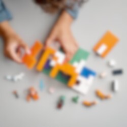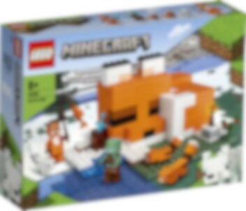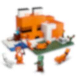 Dankzij verschillende coole personages, authentieke accessoires en eindeloze speelmogelijkheden is LEGO® Minecraft® De Vossenhut (21178) een ideaal cadeau voor kinderen vanaf 8 jaar. Een drukke dag bij het vossenhuis Kinderen zetten al hun Minecraft vaardigheden in om een huis te bouwen dat eruitziet als een slapende vos. Dankzij de open achterkant en het afneembare dak kunnen ze de meubels binnenin gemakkelijk verplaatsen en er allerlei fantasierijke rollenspellen spelen. Buiten vinden ze een jonge vos, volwassen vos en poolvos die ze bessen kunnen voeren voordat de dieren zich opkrullen om lekker te gaan slapen. Dan verschijnt er een verdronken zombie, een populair personage uit de game, om een heleboel chaos te veroorzaken. Kinderen moeten het gevaar afweren met een zwaard voordat ze hun hengel kunnen uitgooien en rustig genieten op hun visstek.