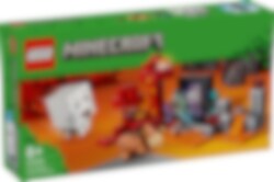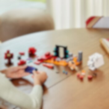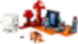 Stap door het Nether-portaal en kom uit bij de grens tussen het Helrode bos en de Basalt Deltas. De Minecraft® set Hinderlaag bij het Nether-portaal zit vol mobs om het tegen op te nemen terwijl je tussen de bomen met paddenstoelen loopt: 2 magmakubussen, een hoglin die kopstoten uitdeelt en een Ghast die schijven uit zijn bek schiet. Wees voorzichtig: als de Ghast je portaal beschadigt, zit je misschien voor altijd vast in de Nether!
