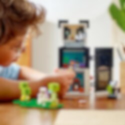 LEGO® Minecraft® Het Panda Huis (21245) is het ultieme speelgoed voor Minecraft spelers met een passie voor panda's. Deze supergrote panda, die ook dienstdoet als huis, zal zeker indruk maken op alle spelers vanaf 8 jaar. Een huis dat eruitziet en beweegt als een panda Dit pandahuis van 3 verdiepingen heeft een opening aan de achterkant waardoor kinderen toegang krijgen tot de gemeubileerde kamers. Door de scharnierende constructie, inclusief het hoofd, kan het pandahuis rechtop, op vier poten of zittend worden geplaatst. Het interieur van de kamers kan steeds worden aangepast. Inclusief een jungleonderzoeker, een panda, een babypanda en een skelet. Buiten bevindt zich een bamboejungle waar spelers zich kunnen uitleven in een geliefd Minecraft tijdverdrijf: taart voeren aan de panda's. Voor extra digitaal plezier heeft de LEGO Builder app intuïtieve zoom- en draaifuncties waarmee kinderen hun model kunnen visualiseren terwijl ze het bouwen.