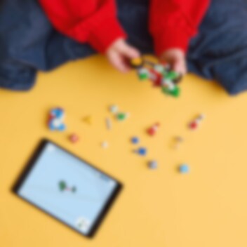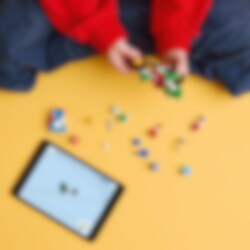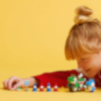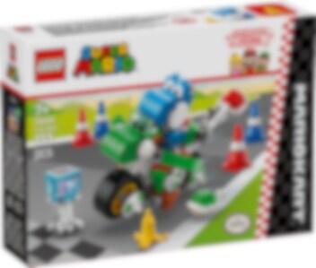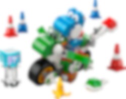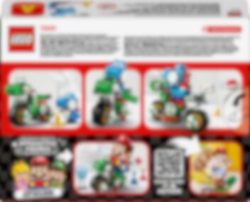 Bereid je voor op Mario Kart actie met de lichtblauwe Yoshi! Rijd op de Yoshi-crosser en ontwijk de verkeerskegels... of lanceer schilden. Maar pas op voor de glibberige banaan! Zet LEGO® Mario, LEGO® Luigi of LEGO® Peach (figuren niet inbegrepen) achter het stuur om Mario Kart geluiden en visuele effecten te activeren en items uit de voorwerpkist te halen om in de race te gebruiken!