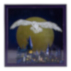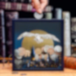 Stoere spaarpot in donkerblauwe kleur met 3D motief van Hedwig die over kasteel Hogwarts vliegt uit Harry Potter. Het beste om je munten in op te bergen, terwijl het een mooi ding is om naar te kijken.