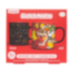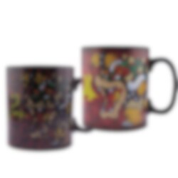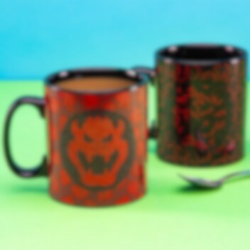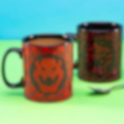 Grote en erg mooie porseleinen mok met een motief van King Koopa Bowser uit de Nintendo-gameserie Super Mario die van uiterlijk verandert wanneer er warme drank in wordt gegoten.