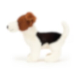 Maak kennis met Albert - een vrolijke en schattige kleine Jack Russell met zachte, roomwitte vacht en kenmerkende zwarte en bruine vlekken. Dit knuffelige knuffeldier met zijn schattige nerveuze oren en vrolijke staartje straalt een vriendelijke gretigheid uit die bijna onweerstaanbaar is. Een heerlijk zachte en trouwe vriend die je eindeloos veel plezier en troost zal brengen. Hij is altijd klaar voor avonturen, spelletjes en knuffels, waardoor deze hond een perfecte en duurzame metgezel is voor alle leeftijden. Kan in de wasmachine worden gewassen op 30°C, fijnwas en indien nodig hangend drogen.