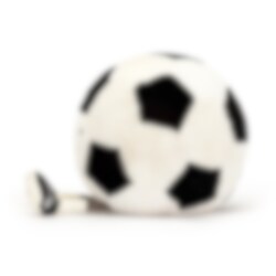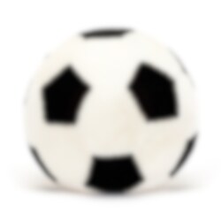 Hier is een leuke en sportieve knuffel in de vorm van een vrolijke voetbal met heerlijk zachte vacht in het traditionele patroon met vijfhoeken in roomwit en zwart. Een charmant personage met grappige beentjes in witte kniekousen en stijlvolle voetbalschoenen van imitatiesuède met geborduurde studs en andere details. Een geweldige vriend of mascotte voor elke voetbalfan, en perfect om mee te vieren wanneer je favoriete team een doelpunt scoort. Als het vuil wordt, kan het in de machine worden gewassen op 30°C, fijnwas en opgehangen om te drogen.