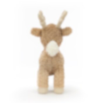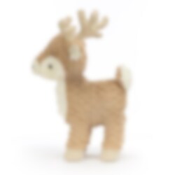 Een schattig staand rendier met een knuffelige vacht in lichtbruin met witte aftekeningen en fluwelige hoorns en hoeven. Dit knuffelbare rendier heeft indrukwekkende hoorns, gevormde hoeven, een schattig staartje en een schattig chocoladebruin neusje, evenals stevige, maar zachte pootjes om op te staan. Ook tijdens de winter of kerst kan het rendier een leuke decoratie worden.