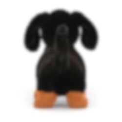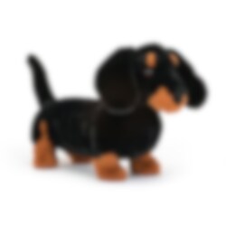 Een lieve, liefdevolle en onverschrokken kleine teckel in gitzwart met oranjebruine vlekken. Een mooi hondje met gevouwen oren, een schattig staartje, oranje wenkbrauwen, nieuwsgierige bruine ogen en een vrolijke en nogal eigenwijze houding. Dit trouwe en speelse krabbetje verlangt ernaar om plezier te hebben, avonturen te beleven, lekker te knuffelen en bij je te slapen. Gemaakt van 100% polyester en indien nodig met de hand gewassen.
